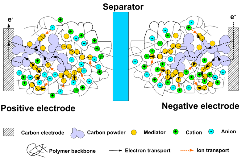 Furthermore, during the charge, the mediator accepts electrons from the anode to form negative charge centers in the electrolyte.